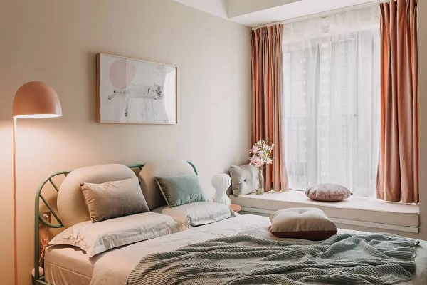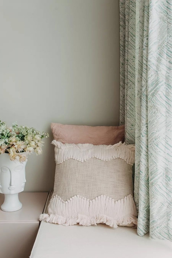 飘窗垫看起来普普通通,但实际上也是定制的颜色,和整体空间做配合。添加了流苏元素的抱枕套,突显了温柔少女心。坐在飘窗上时,一旁的小柜子便可用来放上一杯咖啡,享受下闲暇时光。