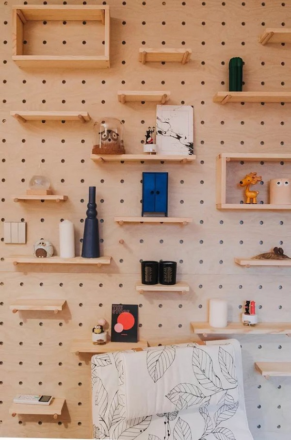 书柜左侧的墙面配置了一整块洞洞板,足以让屋主安放从世界各地带回来的旅游纪念品,而不是把它们闷在柜子里哦。