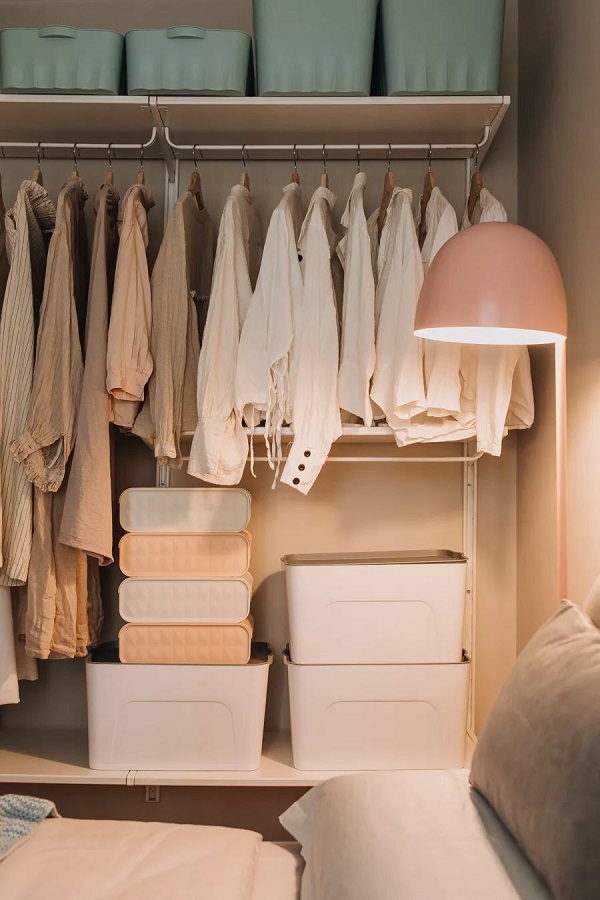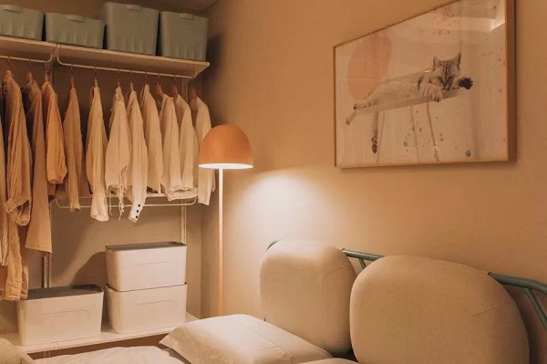 由于次卧较窄,开合柜门的衣柜使用起来不方便。取而代之的是一个开放式衣柜,并且利用层高设计了隔板来放置收纳箱。