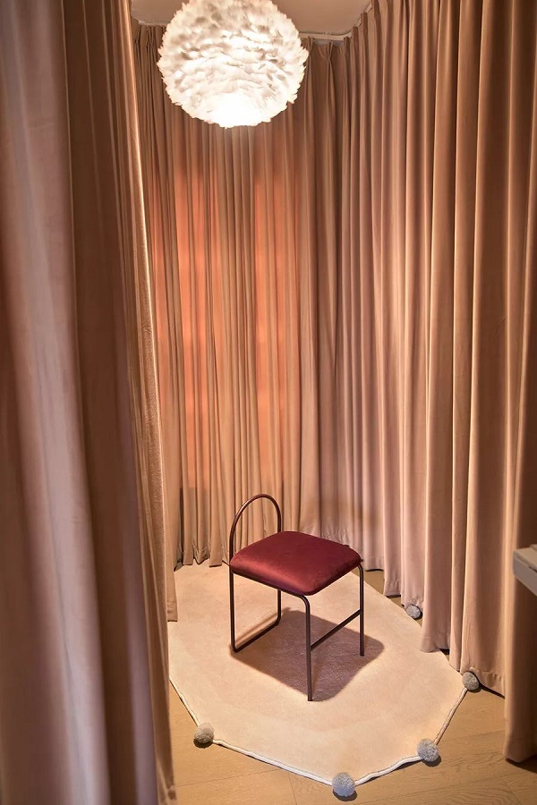 衣帽间位于入户处的右手边,由一间卧室改造而成,空间比较有限。为了不显局促,全部设计成开放式衣柜。缎面的帘子在白色羽毛灯的烘托下,让人有一种美剧大女主之感。