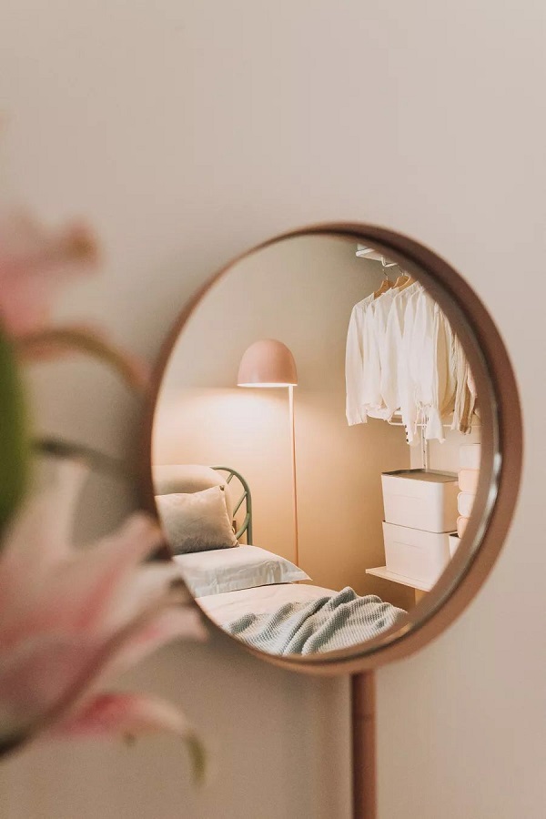 卧室里的粉色帘子后藏有一个小衣帽间,平时拉上帘子便可以很好地隐身。一把黄铜和木材拼接的梯子方便拿取衣柜上方的物品。梯子的第二节处还有一个小镜子的设计,让屋主可以随时保持美貌。