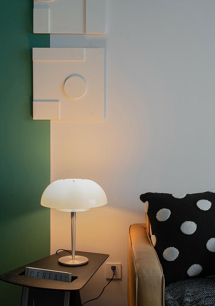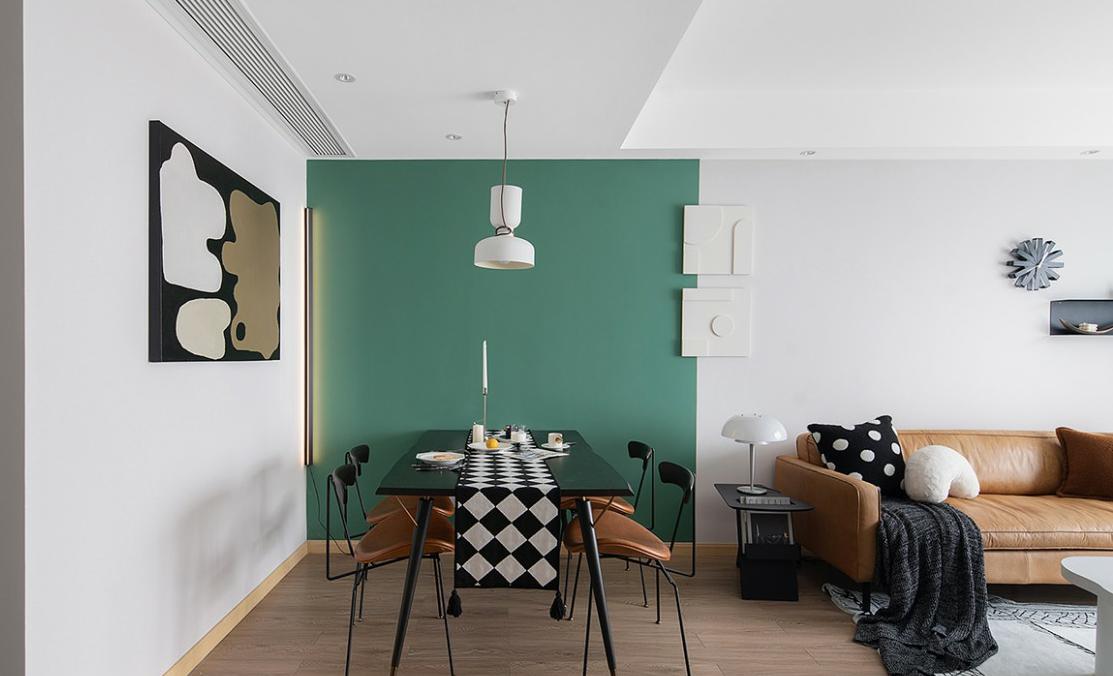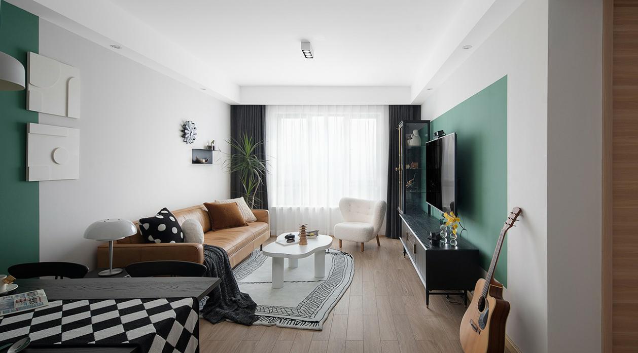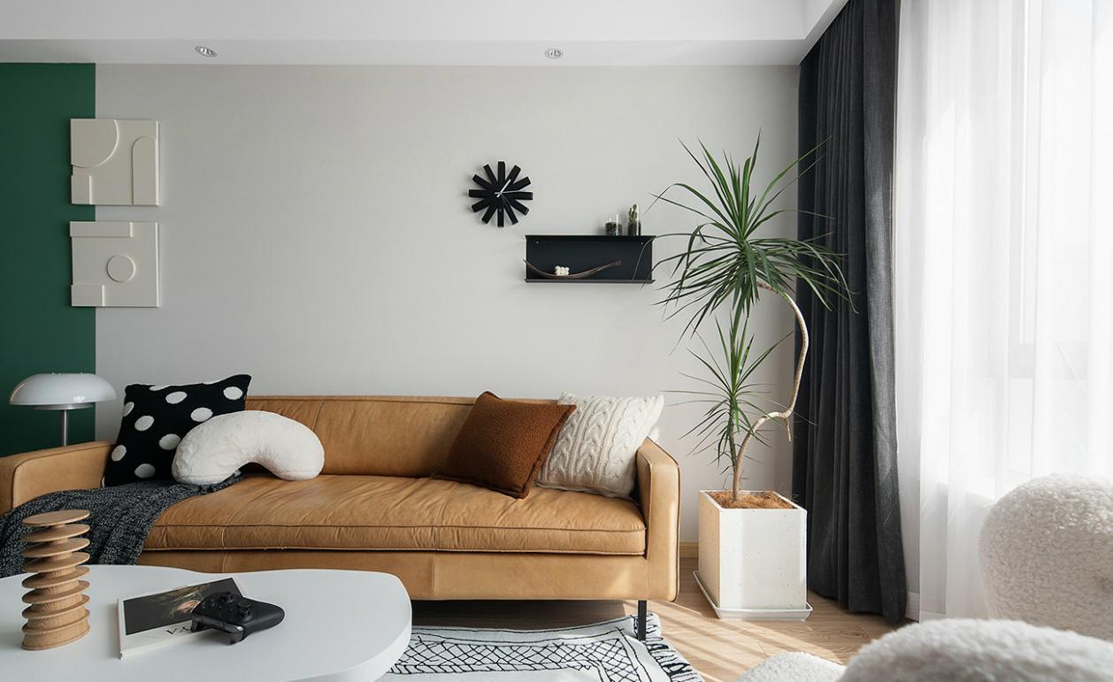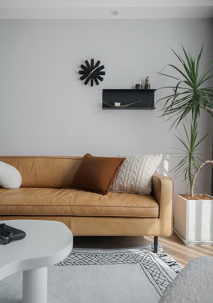 白色为基调的墙体墙辅以亮棕色的沙发,使得空间软装氛围沉稳又不失轻松。 空间的流动性串联起实用功能,用色彩自然分割,材质与设计符号的对立,对话,恰恰是在艺术感与亲和力上寻找一种微妙的平衡点,能够碰撞出花火,能够共生出和煦。