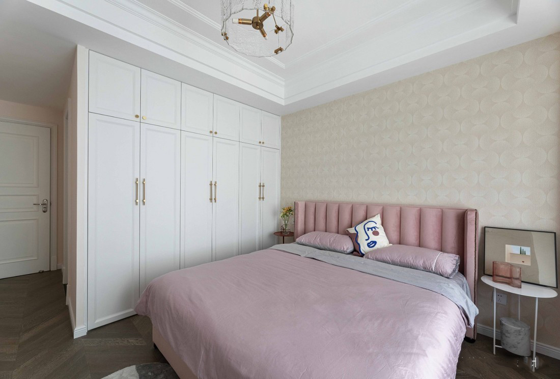 次卧室主要是留给双方父母偶尔留宿来住,整体色调用了清新的绿色,墙面乳胶漆的颜色搭配床头墙布,空间简洁明亮。