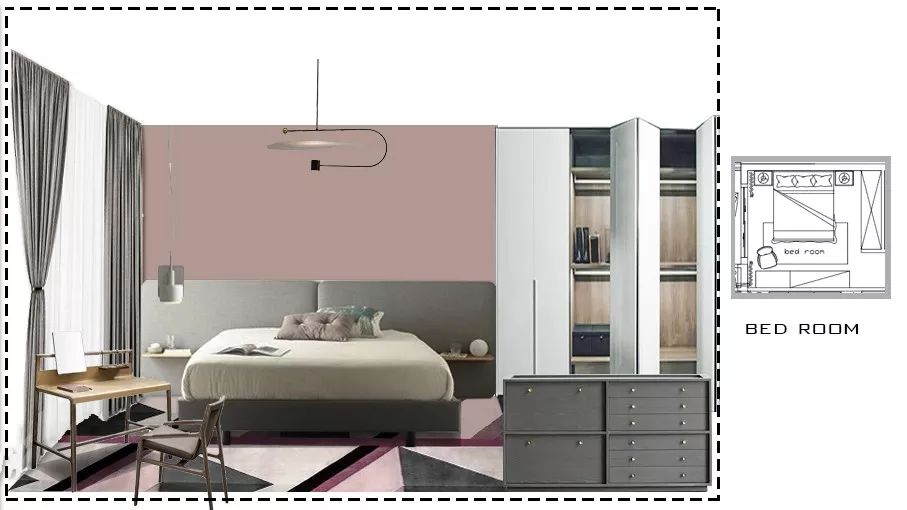 星河熠熠,萤光点点,黄沙漫漫...总有人心怀星辰大海,却甘心昼夜囿于方寸与爱。尝一瓣橘甜,生活,足矣!主卧空间较小,选用无靠背床,床头采用渐变色布艺硬包,恰当且美观。