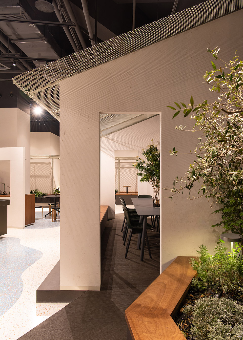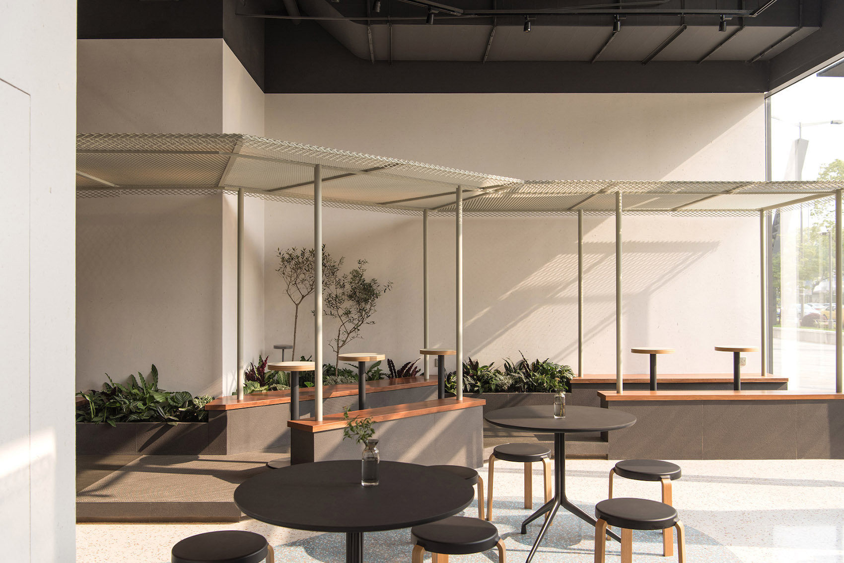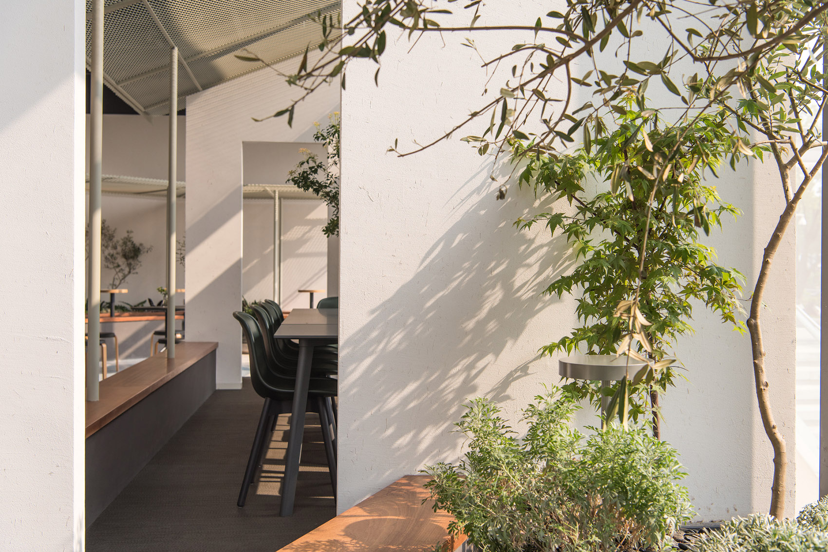 场地位于商场的转角,方形平面的一折为玻璃幕墙,分出室内与室外,室外的草木林荫以借景的方式借入“园”内,亦成为园景的延伸。