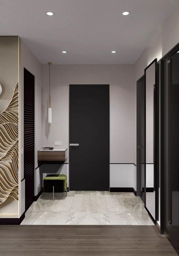 玄关的设计运用简练,墨绿色的换鞋凳,简约的吊灯,与浅灰色的墙壁相得益彰,赋予空间平衡之美,凸显简而不凡的气质。
