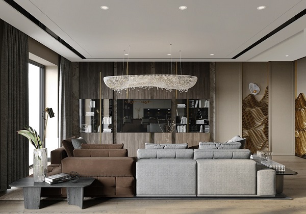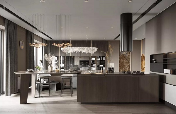 开放式的空间充满了光和宁静,使用简洁的里面表达,建构了纯净、通透的空间氛围。客厅的吊灯精致唯美,自然光的照射从视觉上极大地降低了金属材质的厚实量感,显得轻盈、温和。