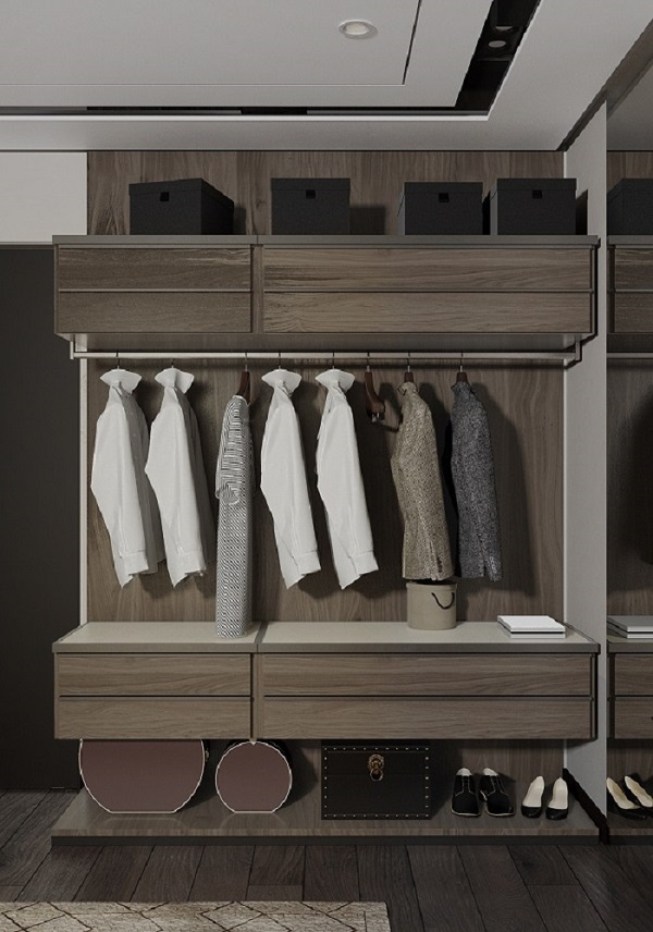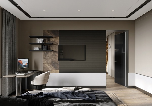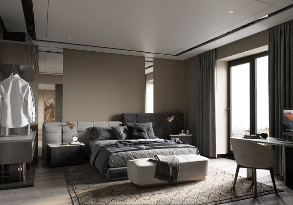 主卧室微妙的灰色装饰带来更柔和的触感,同时与主题保持一致,厚实地毯为空间装饰增添质感和深度。作为一个用于休息的私密区域,它应该具有安静、温馨的特点,采用经典的白灰木三色来营造出沉稳的感觉。