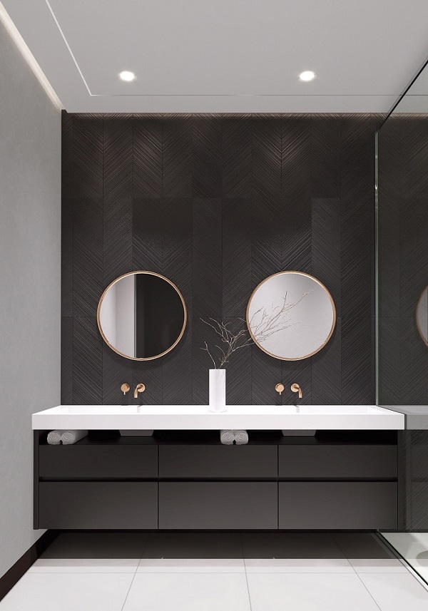 简约的淋浴间、圆形的镜子,暗纹状洗手台背景等处处都呈现出对生活细节的推敲。