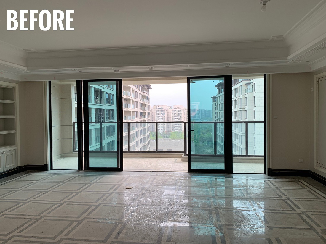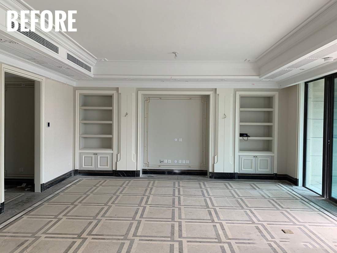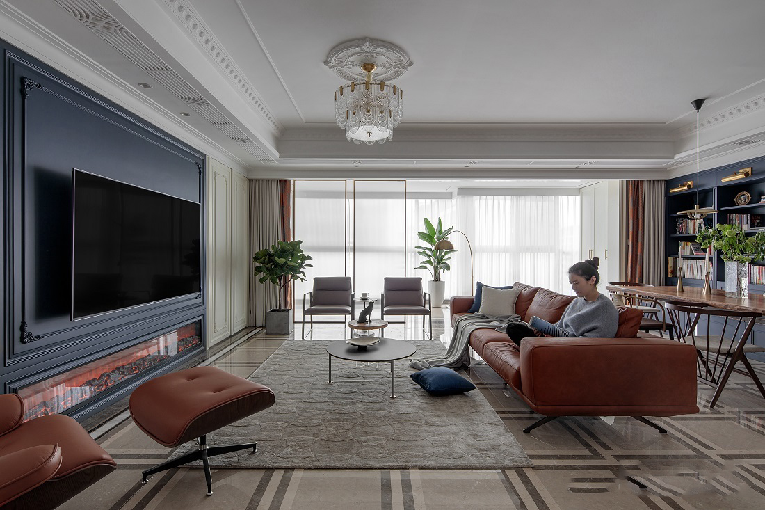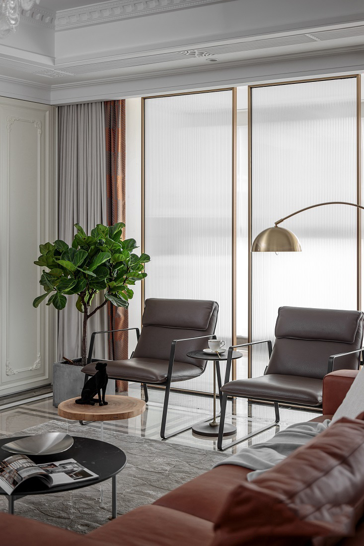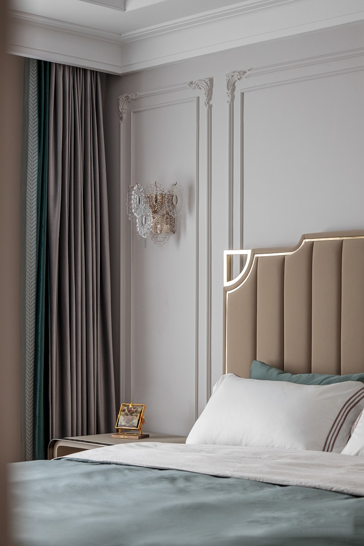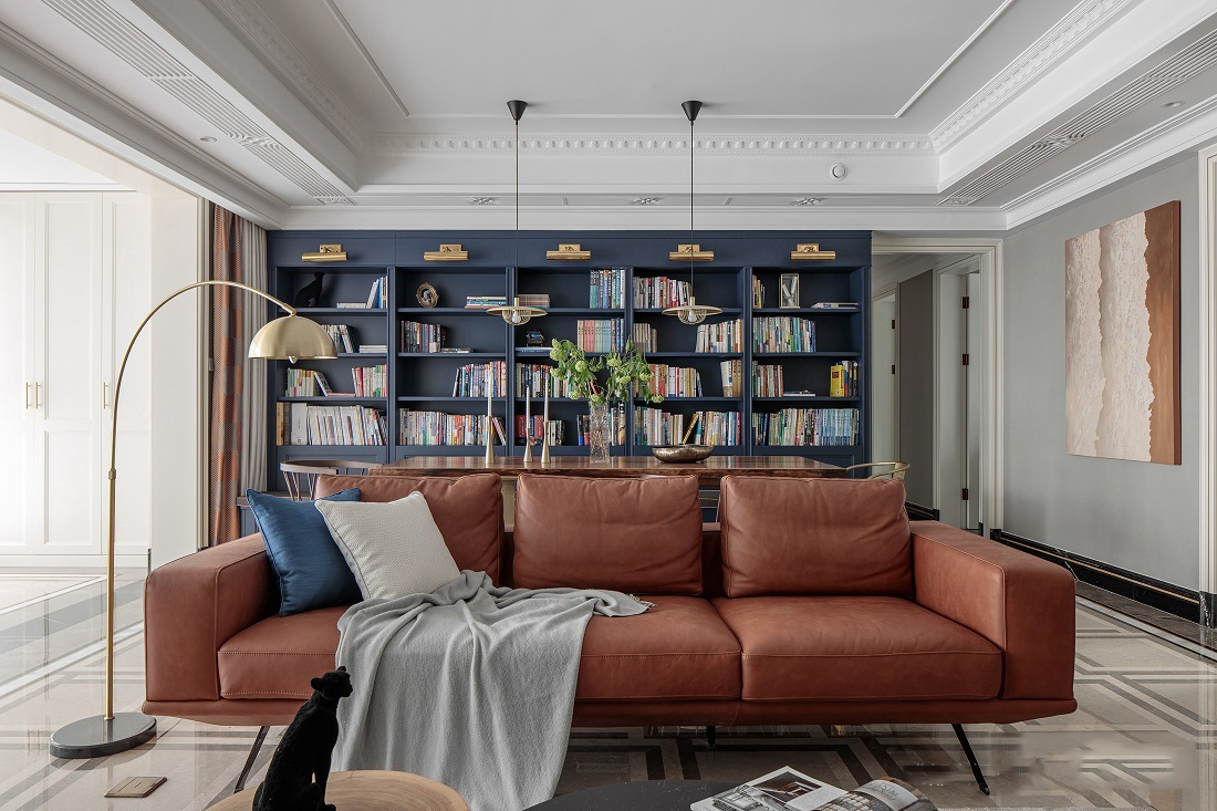 公共空间整体以代尔夫特蓝+驼色为主,营造出复古又摩登的空间气氛。将墙面进行烟灰与亮白的分色设计,在更有空间感的同时,让人身处于此便能感受到别致与优雅并存的一丝丝诗意。