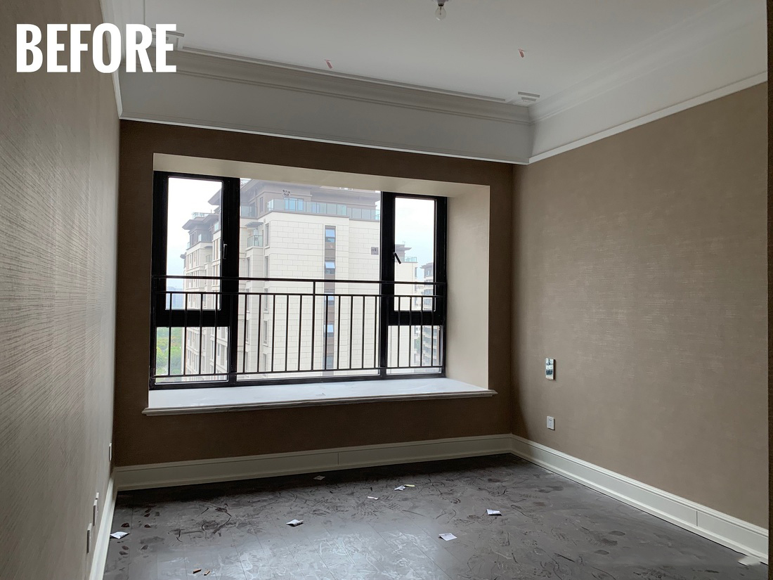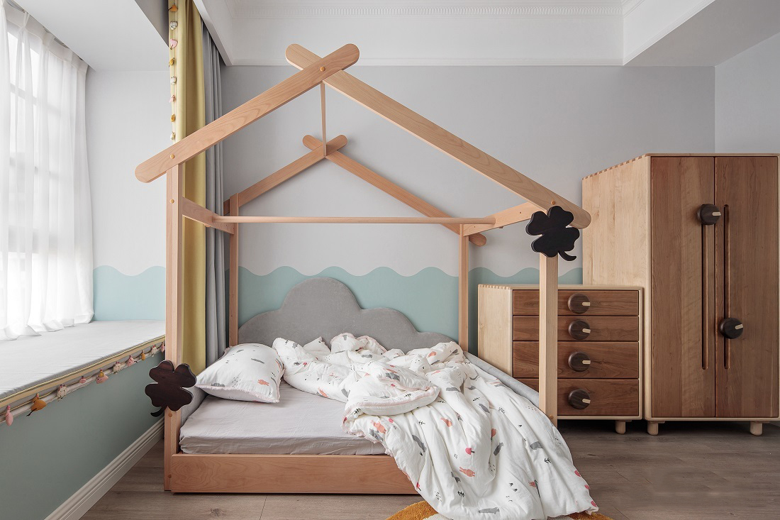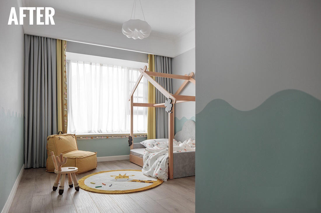 屋主已有准备小孩的计划,但是我们需要在不知道性别的情况下进行儿童房设计。所以我们选择了非常清新且包容的蓝绿色作为主调,并以有趣的波浪线条记性分色墙设计,而活泼可爱的鹅黄色进行软装点缀。
