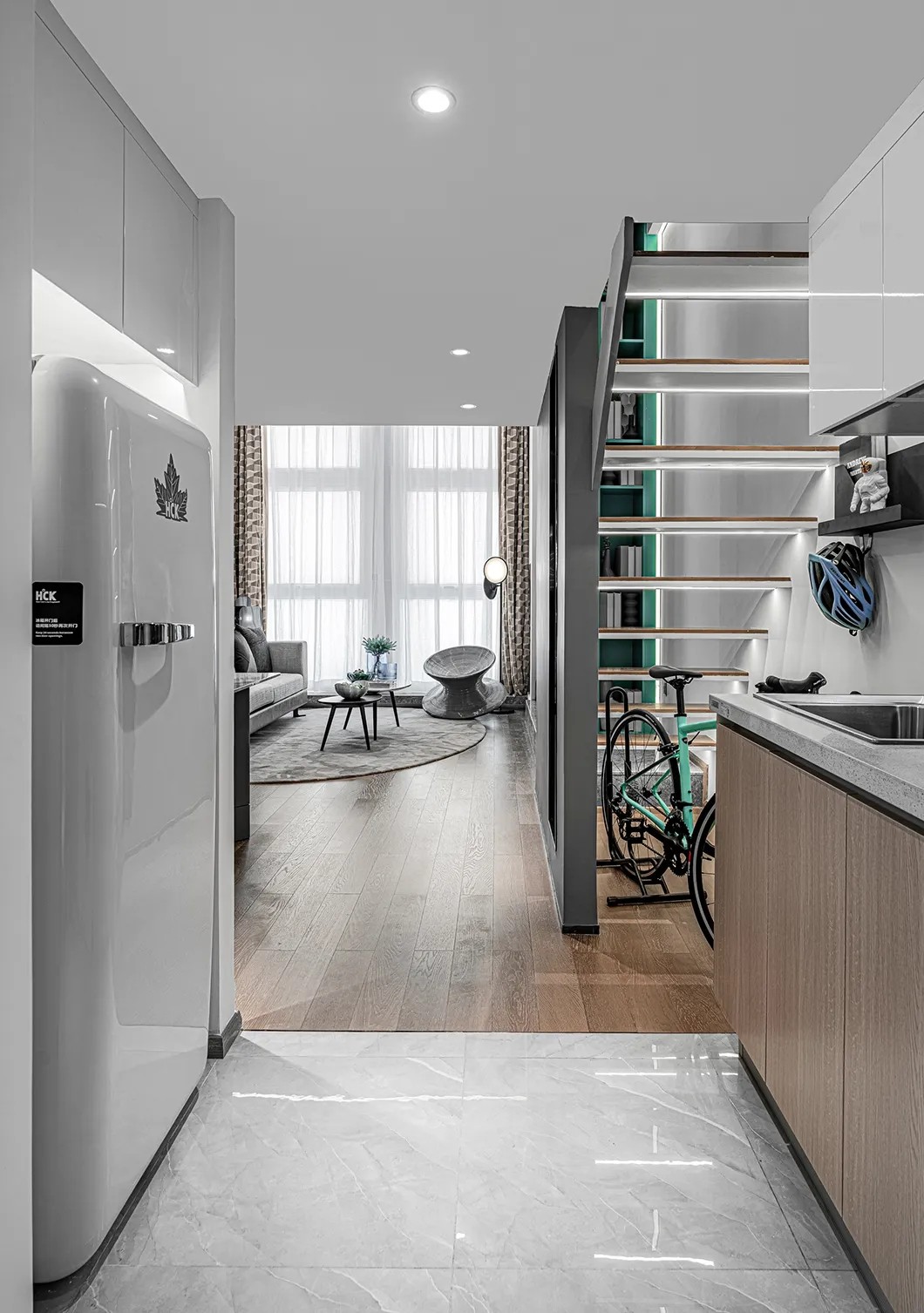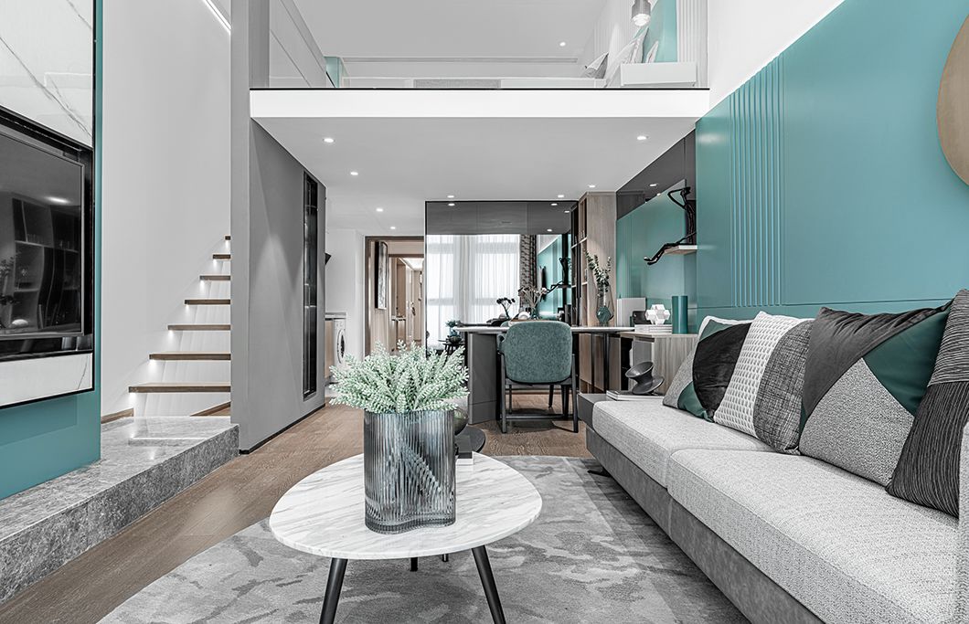 LOFT空间方正平整,上下双层的复式结构,在采光、通风条件和视觉上都相当优越。开放式、少隔断的布局设计令空间更为灵活,功能区域的沟通也更为畅顺。