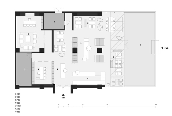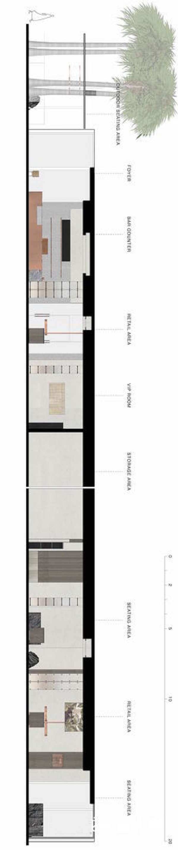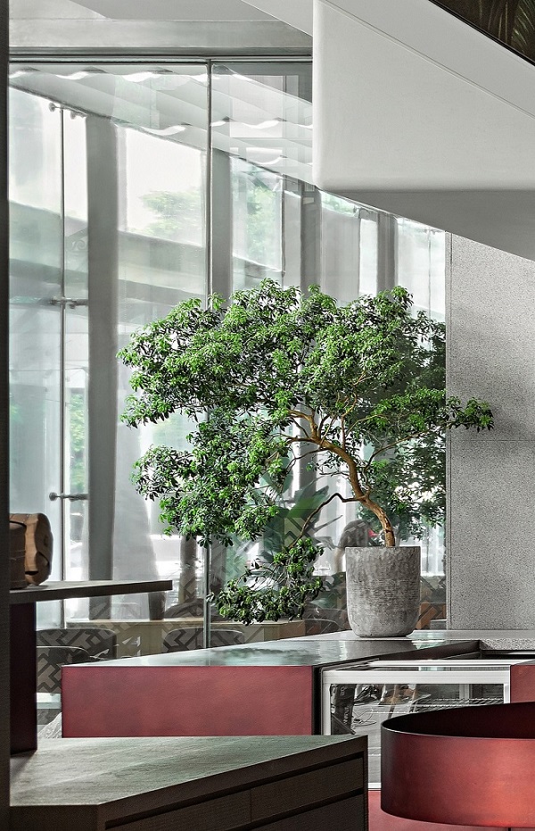 正因如此,整个空间以一种敞开的姿态,以玻璃围合,而在入口处,将玻璃内退,保留一部分区域与环境共融,园中高耸的椰子树也被保留了下来,穿透玻璃天花,作为外摆区域的一部分而存在。