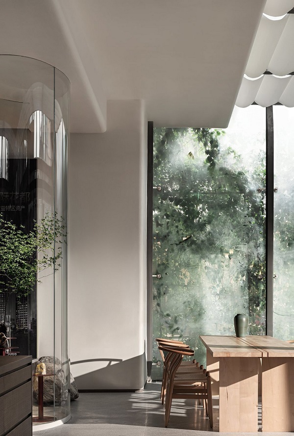 项目由大益茶与华侨城联合打造,择址于深圳最具艺术氛围的华侨城创意园,辟于海景酒店的底层。其保留了原生建筑肌理,也尊重土地自然生发的植物和时间打磨的痕迹,不加以干预,力求自然而然。