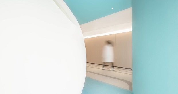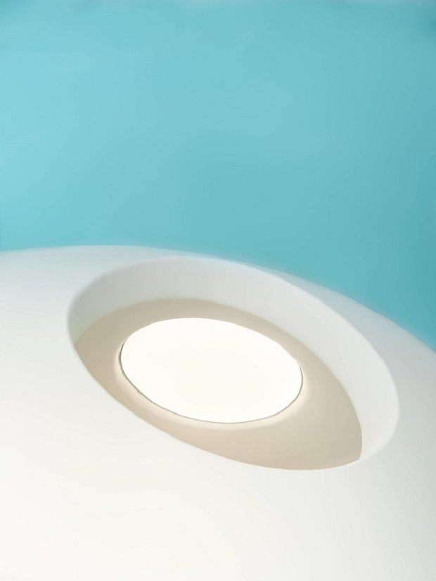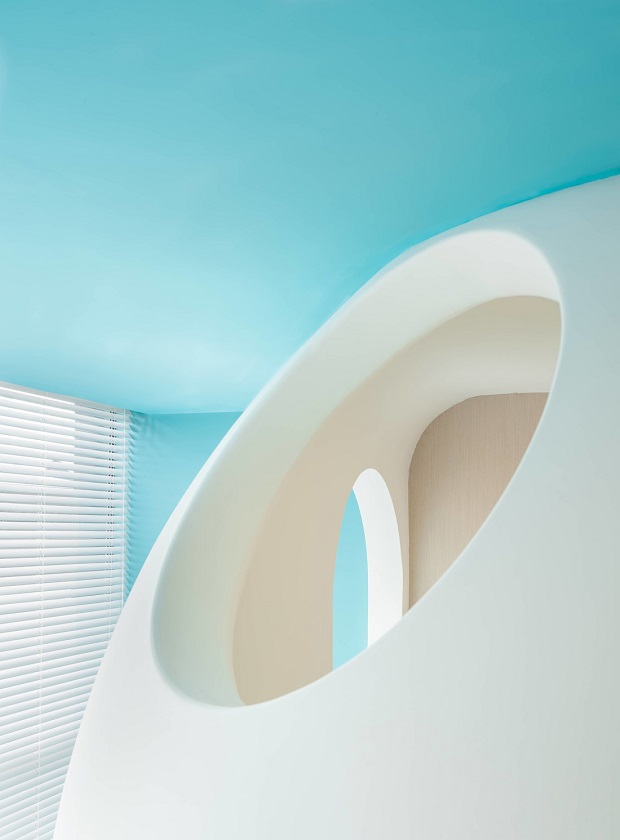 ▲日光略过弧面,基于结构,光与空间的丰富性自然生成。艺术的光线以一种抽象的方式介入洁净的蓝白主调中。
