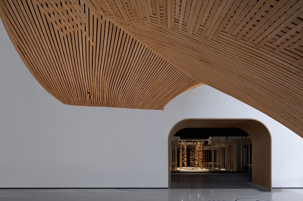 二层采用曲线异形的灵动布局,与首层形成对比关系。借鉴绍兴山水自然形态,仿佛游走在书的山水之中。苏东坡说过,宁可食无肉,不可居无竹,文人雅士对竹子的喜爱由来已久。因此本案以“竹林赏书”为灵感营造一种文人雅士的书店。