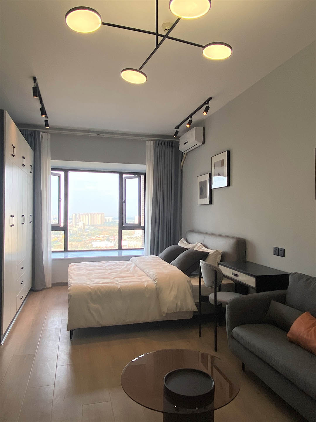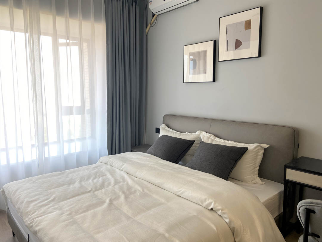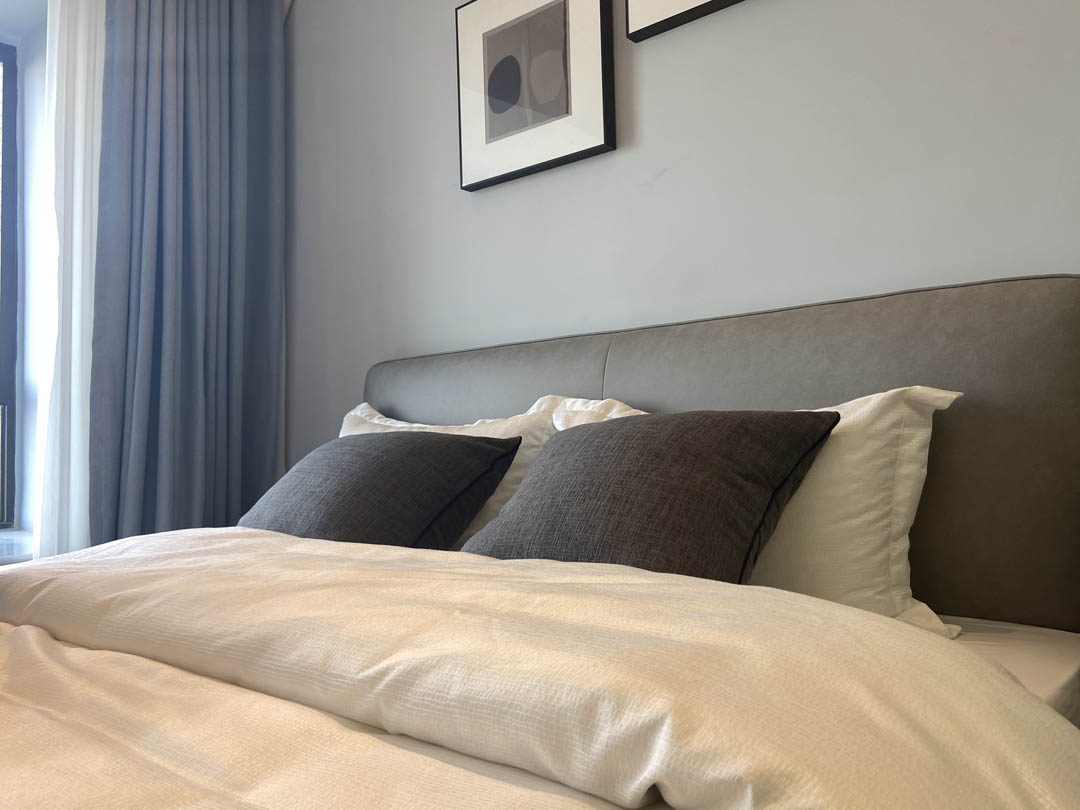 卧室空间延续原有整体黑白灰色系,线条简约利落,搭配可调节方向的三色轨道射灯,碰撞出丰富的视觉变化。