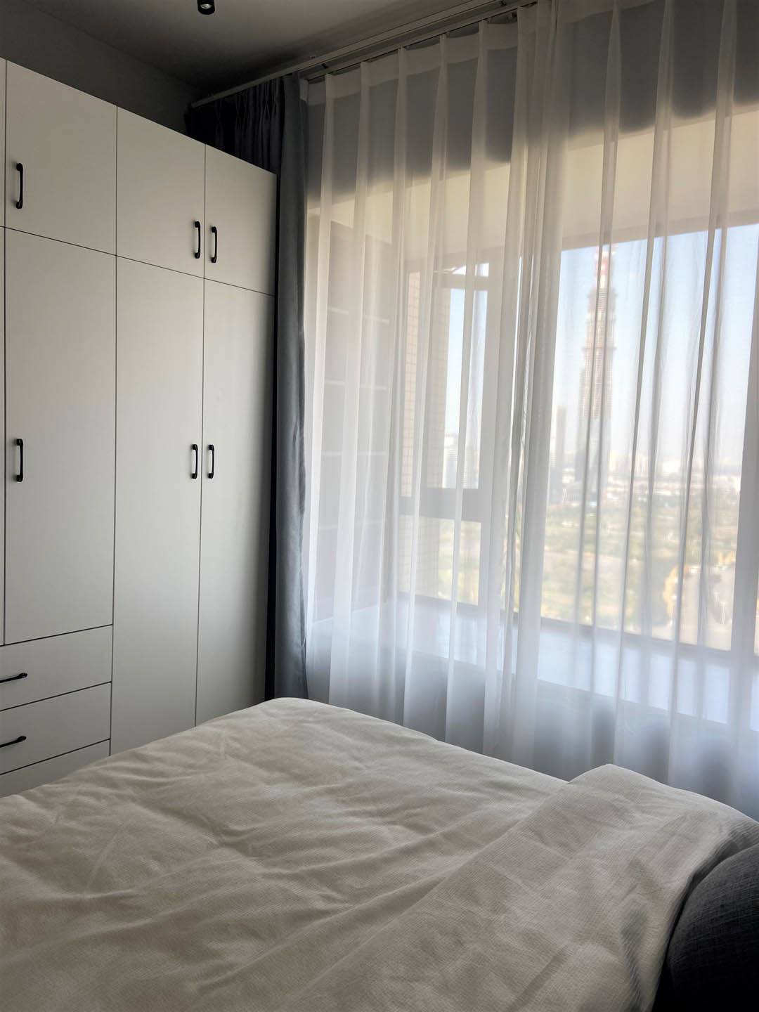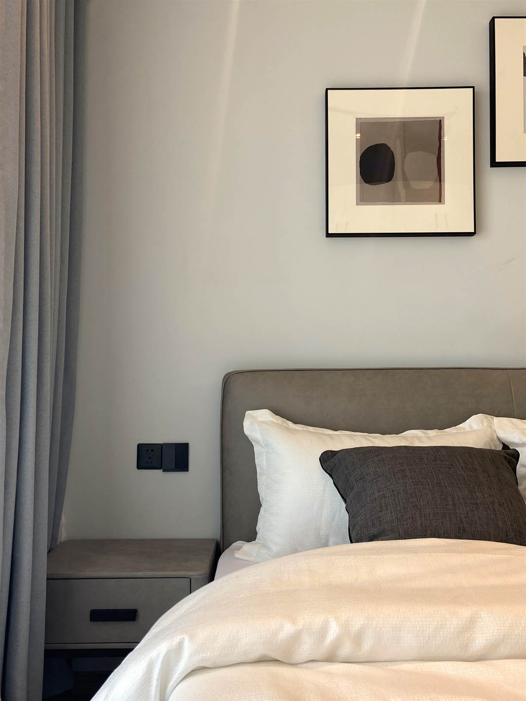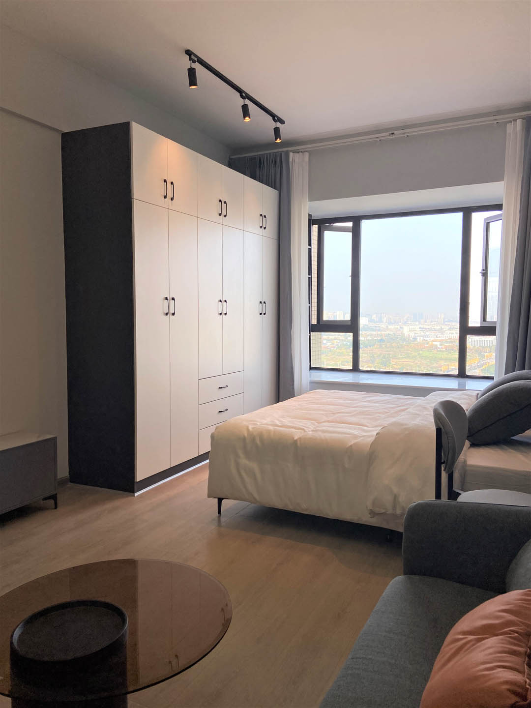 卧室空间延续原有整体黑白灰色系,线条简约利落,搭配可调节方向的三色轨道射灯,碰撞出丰富的视觉变化。