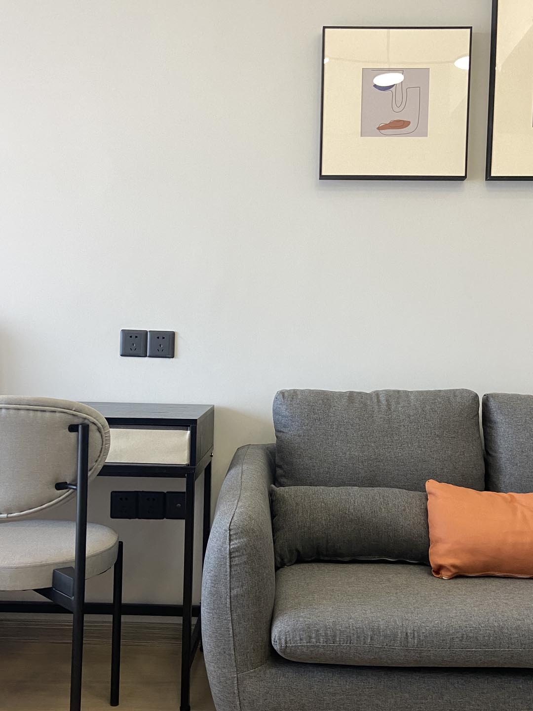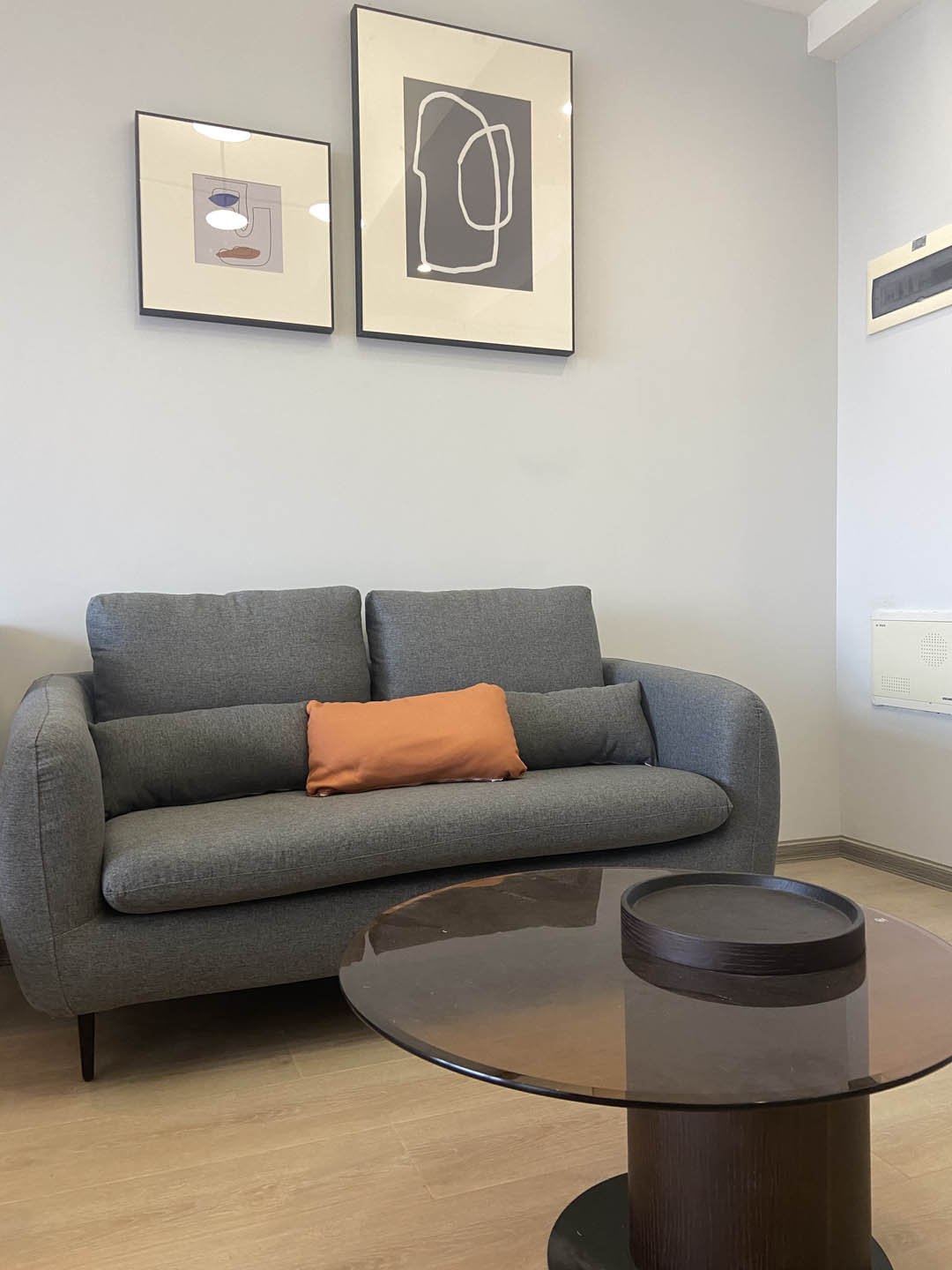 客厅面积不大但却相当舒适,灰色双人布艺沙发搭配棕色玻璃茶几,顶部配于极具工业风的吊灯,与沙发背后几何抽象挂画,增添了空间的精神与视觉双重感受的变化。