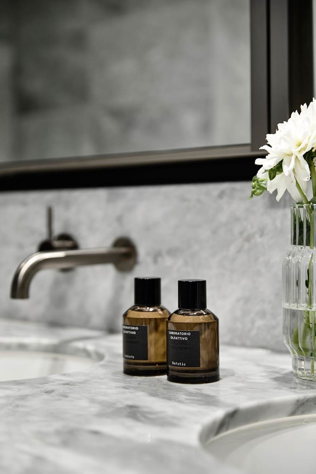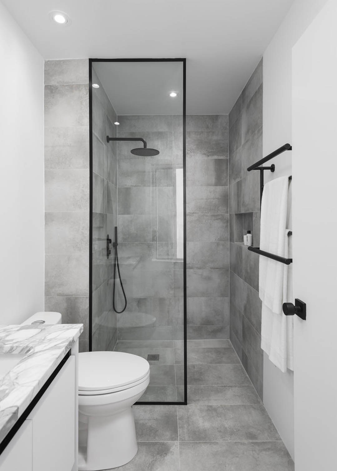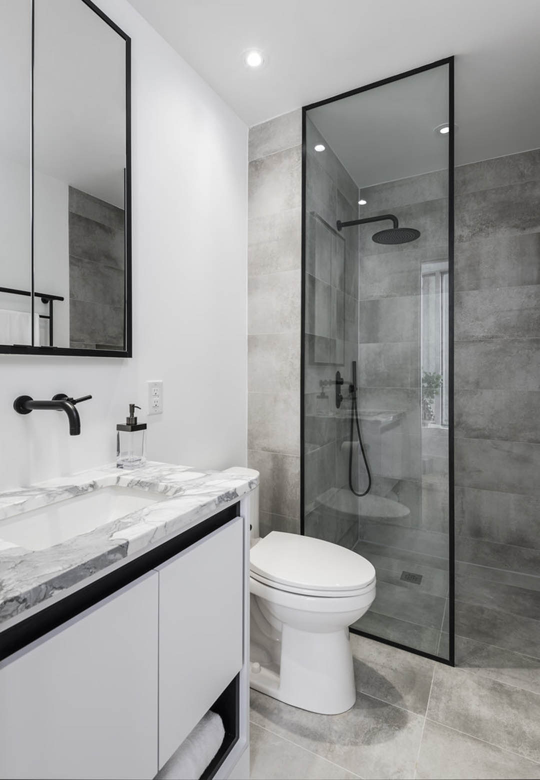 灰色渐变瓷砖给予人神秘的感受,淋浴间用透明玻璃进行干湿分区。灰白纹理大理石台面与极简金属龙头,结合墙柜镜面进一步延展了视觉,带给居者整洁舒适的空间感受。