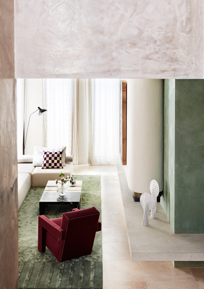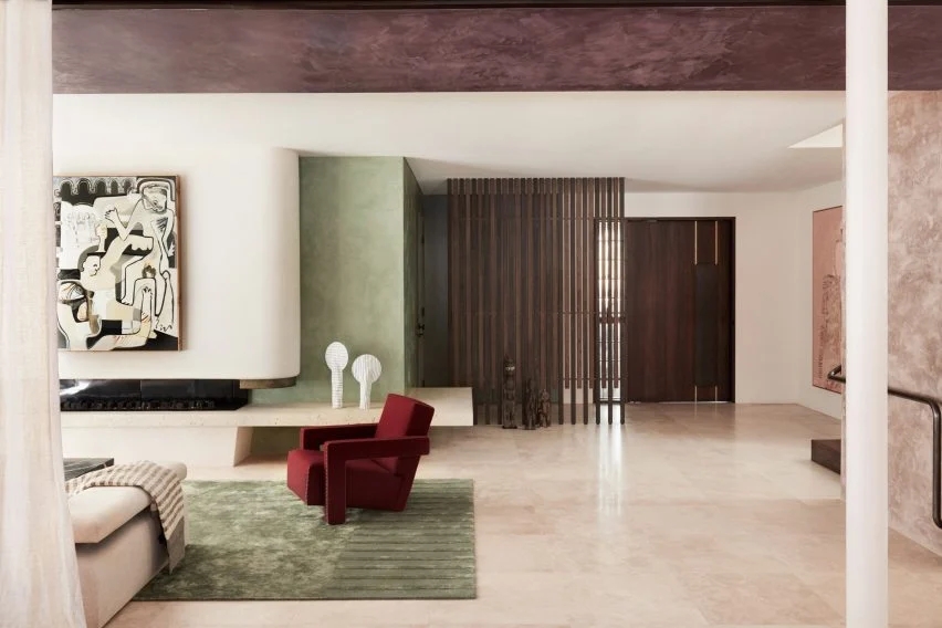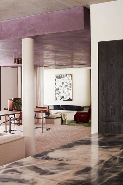 这整个表面都松散地涂上了紫红色或奶糖色的大理石灰泥,形成了工作室“抛光和原始饰面相互作用”的独立背景。工作室解释说:“色调和触觉的变化修饰了场景,通过色彩和表面铜绿描绘出中性区域。”