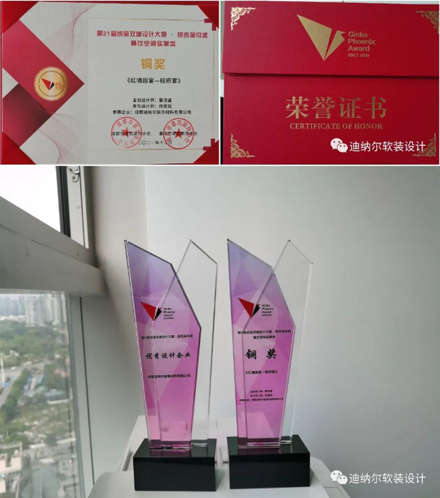 在众多的参赛实体项目和作品中,我迪纳尔软装公司的“红墙国宴—程府宴”获得餐饮空间项目“铜奖”,“英伦城邦样板间”获得了陈设艺术空间项目“优秀奖”,同时迪纳尔软装和公司参赛设计师亦收获了第21届成渝双城设计大展-银杏金鸟奖的“优秀设计企业”和“优秀设计师”等荣誉。