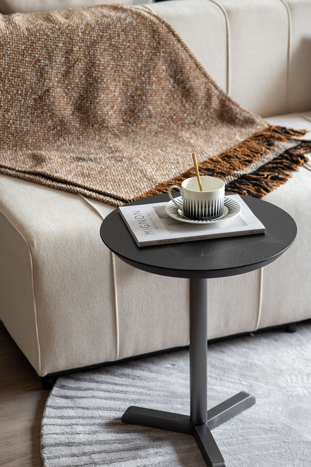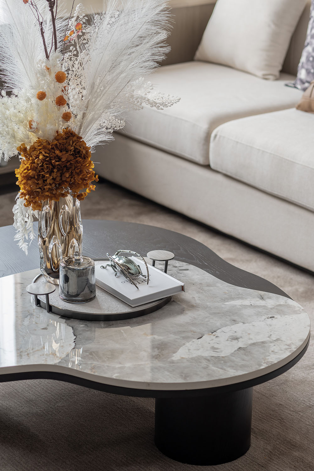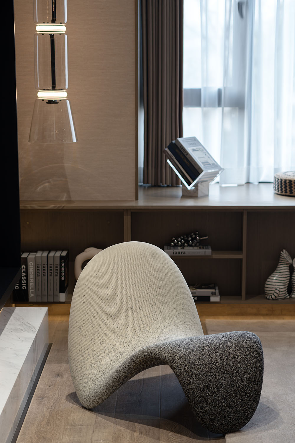 非常规的布艺的沙发款式,搭配不规则造型的茶几,增添空间的多变性的同时也增加了居住者的体验感。家具的选型奠定了极简的空间基调。浅木色的地板为空间增加暖意,营造温馨舒适的空间氛围。