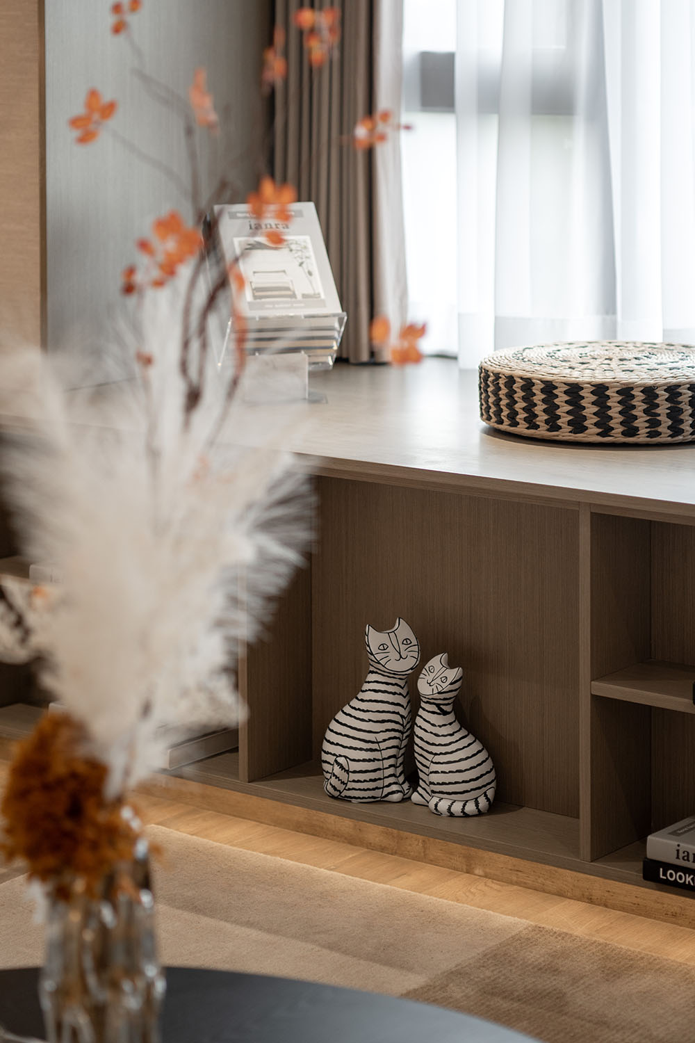 为使空间规划利用合理,我们将飘窗侧面做上了柜体,可以摆放日常的书籍也可以置放一些小摆件。既美观又能够合理利用。也让参观的人们能够看到它的可塑性。台面放上蒲团和一个小茶几,两人,一盏茶,一下午,休闲雅致。