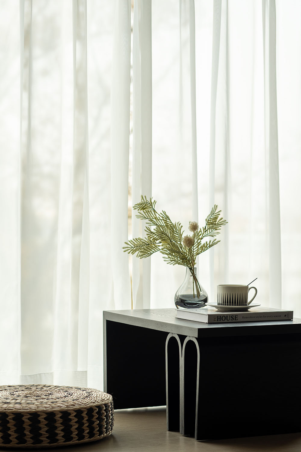 飘窗与床头的衔接处做了一个小小的梳妆台,满足日常必要的使用,木色主导整个空间。白色窗帘清清爽爽,营造出易于安眠的空间氛围。