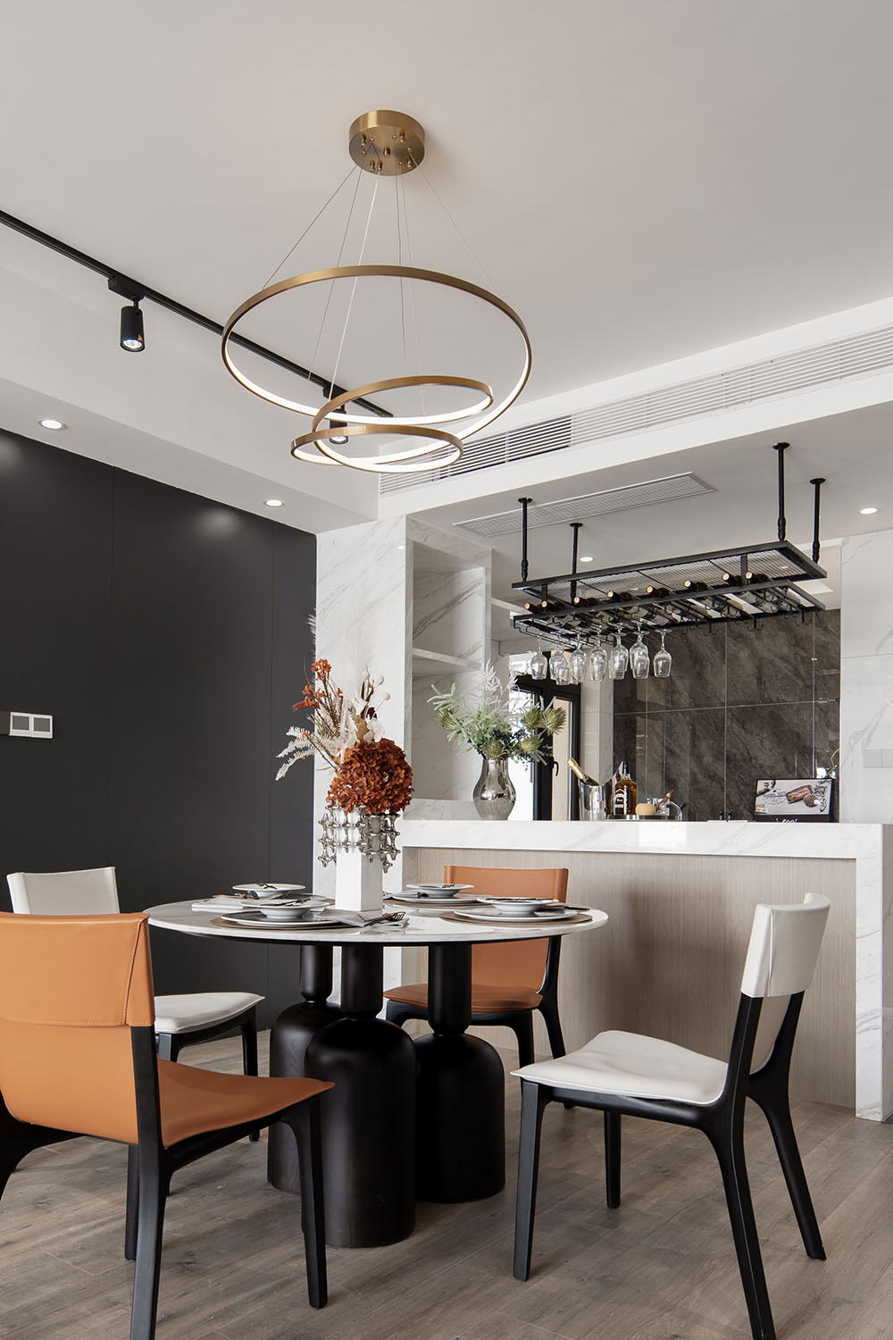 常见的黑白灰现代简约风格,设计师在餐椅的配色上专门加入了整个空间的跳色和客厅相得益彰。加入花艺的搭配给空间增添活力。