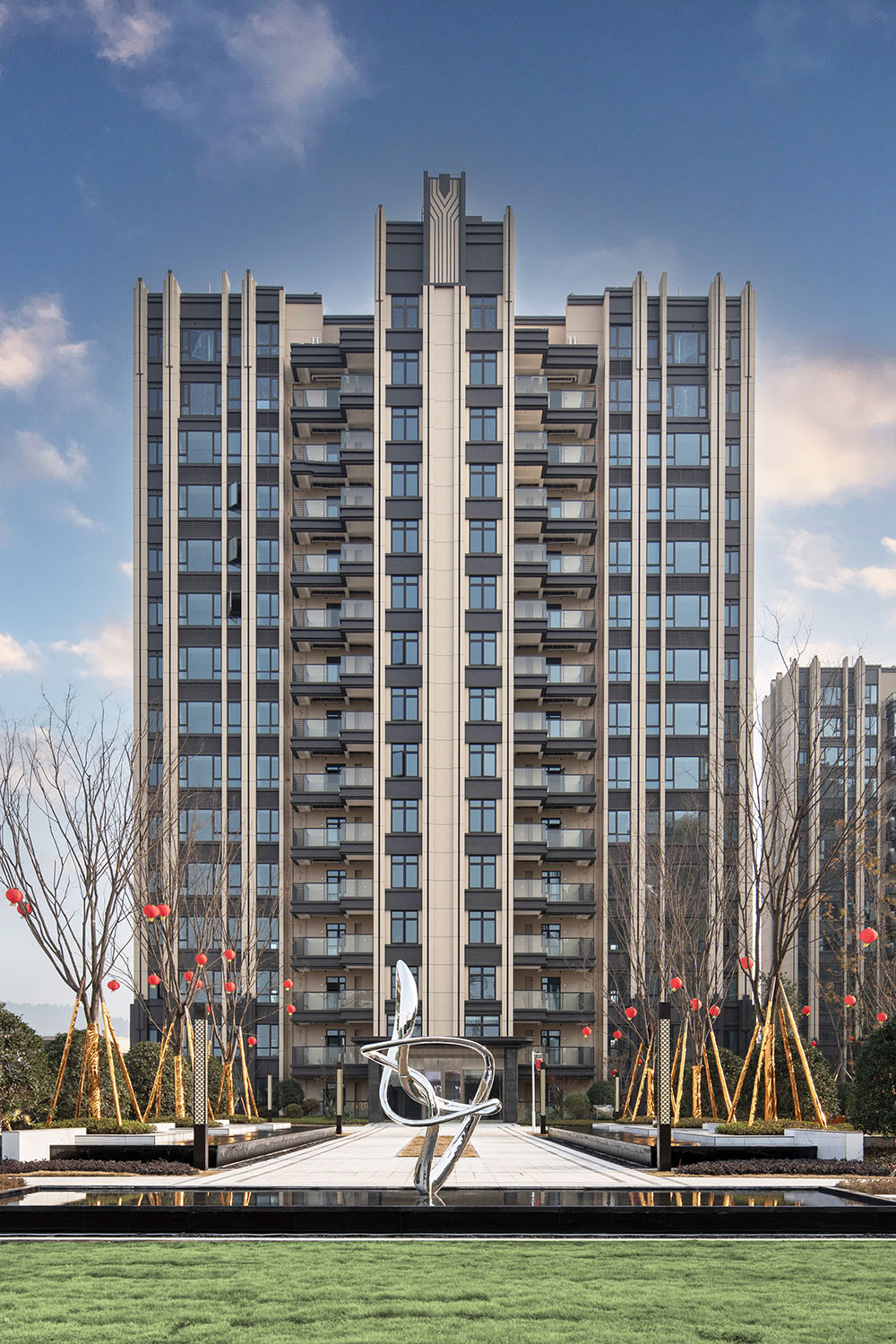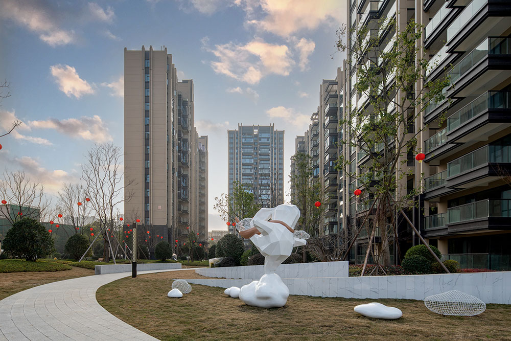 作为园区的中庭,水景雕塑的选型无疑是一个重心。作品本质上具有积极向上的象征意义,侧面看犹如一个幼苗在怀抱下逐渐向上延伸,雕塑的形式围绕“立体构成”的设计原理进行创作,很多“立体构成”的抽象雕塑在城市中在协调、衬托、美化、装点环境和空间起到了统一美感的装饰效果。